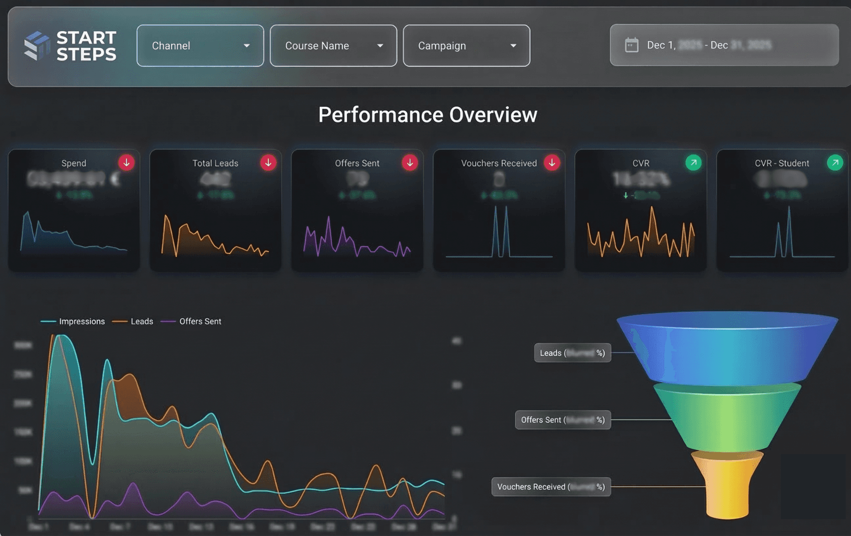 Looker dashboards were built with interactive filters for channel, campaign, and course. Key metrics include spend, leads, offers sent, and vouchers received. The interface enables real-time monitoring and analysis for optimized campaign management.