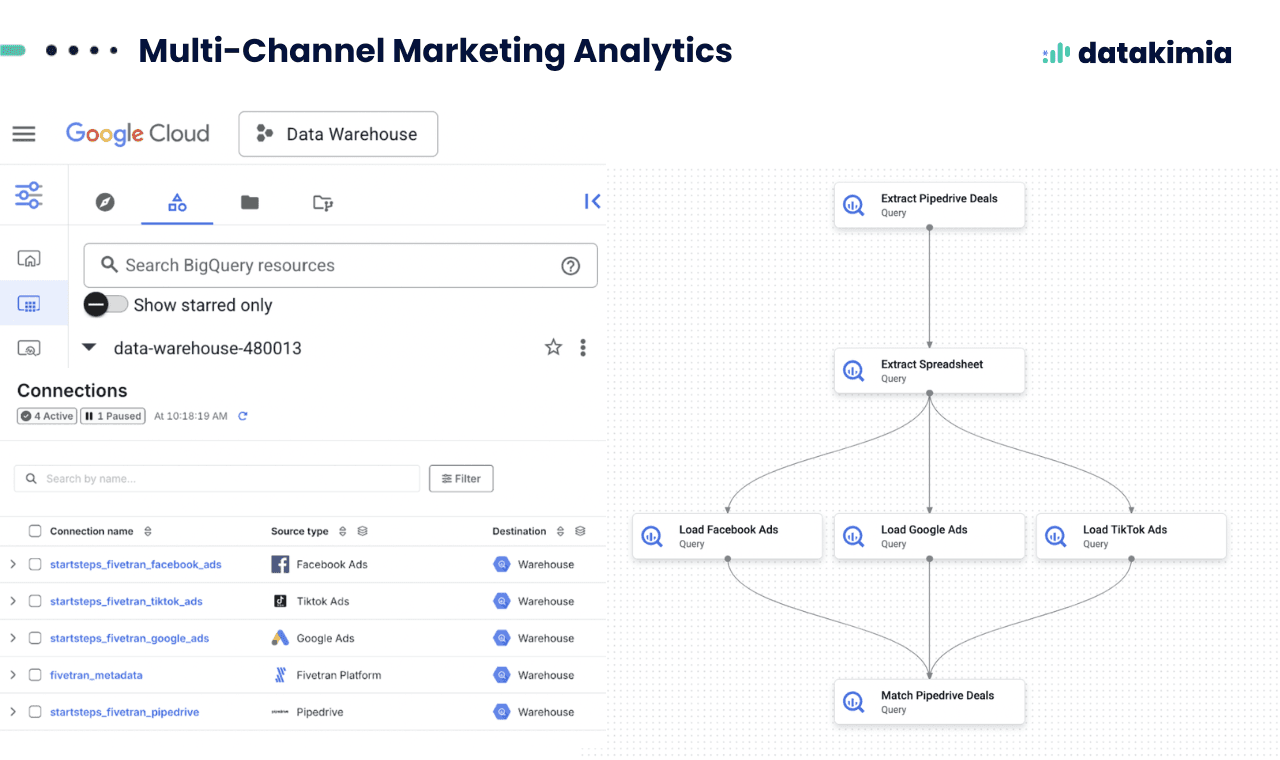 Fivetran was configured for Facebook, Google, and TikTok Ads. A custom Python connector on Google Cloud Functions was developed for Pipedrive to handle token limitations, delivering JSON/CSV data to Cloud Storage.